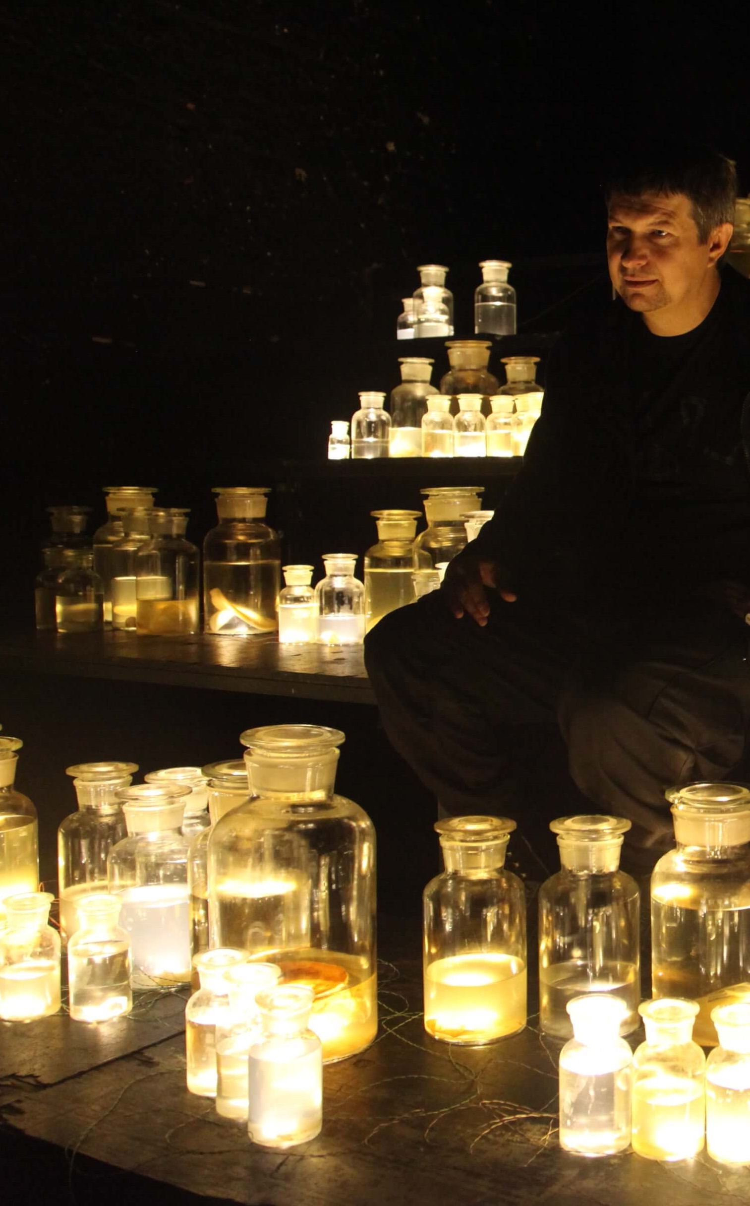 Художник работает с различными медиа: объект, инсталляция, видео, фото, изображение, акция, перформанс, звук, текст